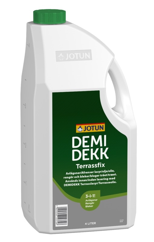 träolja och lasyr. Ljusar upp träet innan vidare behandling med DEMIDEKK